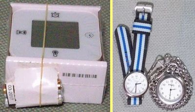 アナログの防水時計(電池式クォーツ時計)を二個用意。前者は日本時間で利用。後者は出国前に渡航先の時間にする。デジタルの置時計は防音の為に電池をテープで張る。 宿に到着してから利用し帰国日に抜く。